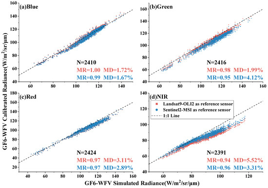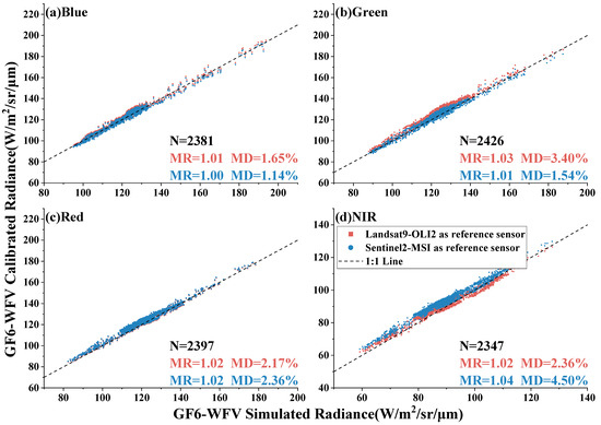 Evaluation and validation of radiance results for GF6-WFV simulated using Sentinel2-MSI versus calculated using radiometric cross-calibration coefficients (MD and MR are the mean relative difference and mean ratio, respectively).