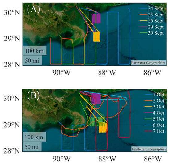 Flight route map for airborne LiDAR detection in the Gulf of Mexico from 24 September through to 7 October. (A) shows the flight path in September and (B) shows the flight path in October.