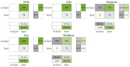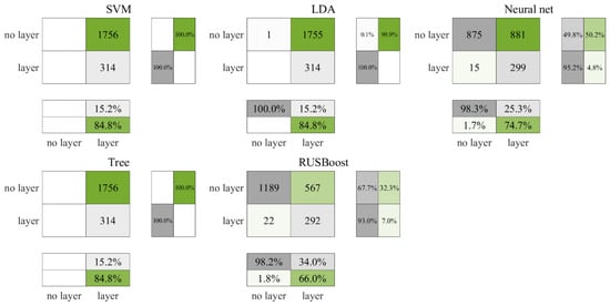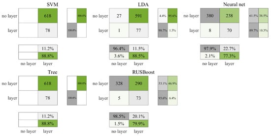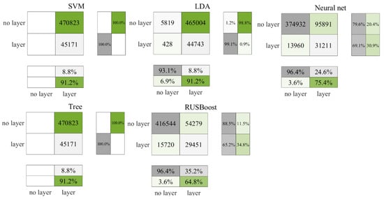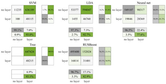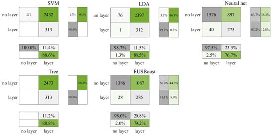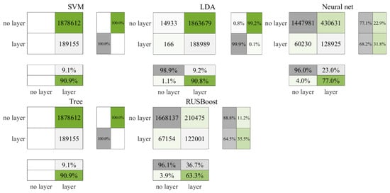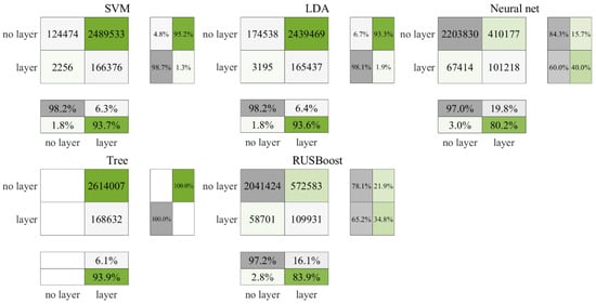 Figure 9 and Figure 10 present the test and cross-validation outcomes for nighttime ROL data, respectively. Echoing the patterns observed in earlier findings, RUSBoost achieved the most robust performance followed by the neural network, with both SVM and the decision tree categorizing all data as layers. During the testing phase, LDA similarly classified all data as layers, whereas the cross-validation phase showed a marginal improvement, with one non-layer data point being correctly identified. As illustrated in Figure 10, in the cross-validation phase, RUSBoost correctly identified 314 more non-layer data points than the neural network, albeit accurately identifying seven fewer layers. The neural network misclassified 50.2% of non-layer data as layers, in contrast to RUSBoost, which was found to have a lower misclassification rate of 32.3%. Consistent with previous trends, the results shown in Table 8 confirm the fact RUSBoost secured the highest F3 score among the evaluated metrics.
