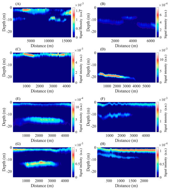 Example of phytoplankton layers in the Gulf of Mexico; (A–D) are single layers and (E–H) are multiple layers. The X-axis is the distance flown by the airborne lidar and the Y-axis is the depth below sea level. The color bar is the signal strength of the lidar (a.u.).