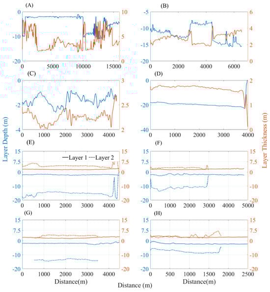 In this study, phytoplankton layers were delineated using layer labels from LiDAR data, as cited in reference [32]. The characteristics of selected phytoplankton layer profiles are illustrated in Figure 11, with their depth and thickness details presented in Figure 12. Single-layer regions, designated as (A–D), exhibit average depths of −4.17 m, −11.80 m, −1.61 m, and −13.02 m, respectively, in addition to average thicknesses of 4.14 m, 2.80 m, 2.25 m, and 1.16 m. Profiles (E–H) reveal dual-layer regions, with average depths for the shallower and deeper layers being −1.83 m and −15.08 m, −1.78 m and −11.08 m, −1.8 m and −13.59 m, and −2.05 m and −7.51 m, correspondingly. The thicknesses for these deeper layers are noted as 1.97 m and 4.63 m, 2.07 m and 3.06 m, 2.19 m and 3.68 m, and 2.72 m and 3.34 m, respectively. A comparison of the layer labels with profile outcomes suggests an oversight of deeper layer labels particularly in regions comprising multiple layers. For instance, the results shown in Figure 11E indicate layer presence at distances beyond 4000, though there exists a significant layer within the 1000–4000 distance range at a depth of 17 m, which seems to have been overlooked in labeling.