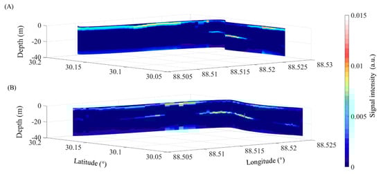 Three steps are required to preprocess the converted PNG image data, which are surface detection and smoothing, surface correction, and depth adjustment. The first two steps aim to compensate for aircraft altitude variations, and the depth adjustment is to reduce the dimensionality of data and reduce the time for calculation. The cross-polarized channel data were used for both surface correction and depth adjustment since the cross polarized data provide a better contrast between the phytoplankton layer and the background water column. Water surface detection involves finding the maximum echo of each LiDAR data in the co-polarized channel and moving up to 25% of this maximal echo.
