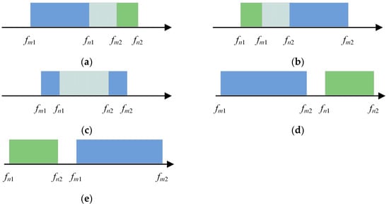 Spectral overlap between the jammer and radar in the frequency domain: (a) ; (b) ; (c) ; (d) ; (e) .
