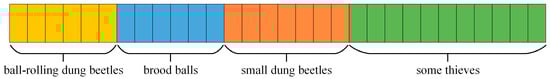 Therefore, the dung beetle population in the algorithm is divided into four categories, namely, the ball-rolling dung beetle, the brood ball, the small dung beetle, and the thief, as shown in Figure 3. The population is divided into the different roles in a ratio of 6:6:7:11. In other words, according to the population size in Figure 3, out of 30 individuals, six dung beetles are assigned to engage in ball-rolling behavior. These ball-rolling dung beetles adjust their running direction based on various natural environmental influences, initially searching for a safe location for foraging. Another six dung beetles are designated as beetles engaging in reproductive behavior, and the reproduction balls will be placed in a known safe area. Seven dung beetles are defined as small dung beetles, which forage in the optimal foraging area. The remaining eleven dung beetles are classified as thieves, and thief dung beetles search for food based on the positions of other dung beetles and the optimal foraging area.