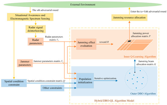 An evolutionary reinforcement learning method called the hybrid DBO-QL algorithm was developed for the cooperative-jamming resource allocation model involving the complex constraints constructed in Section 2. The principle of the proposed algorithm is elaborated in detail below.