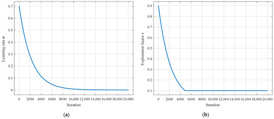 For the hybrid DBO-QL algorithm, weighting factors , , , , and were set to 0.35, 0.25, 0.4, 0.65, and 0.35, respectively. For the outer-layer DBO algorithm, the maximum iteration count corresponded to , and the population size corresponded to ; for the inner-layer Q-learning algorithm, the maximum iteration count corresponded to , and the discount factor corresponded to . An adaptive strategy was employed for the learning rate and exploration factor in this paper. In the initial stages of the algorithm, where exploration is emphasized, relatively larger learning rates and exploration factors are used to enable the algorithm to explore the solution space rapidly. As the training progresses, the learning rate and exploration factor gradually decrease, provoking the transition of the algorithm into the exploitation phase, where smaller values of these parameters facilitate convergence to the optimal result. The definitions of the learning rate and exploration factor in this paper are provided in Equations (35) and (36), and their function plots are shown in Figure 7. The initial learning rate was set to 0.7, and the initial exploration factor was set to 0.9.