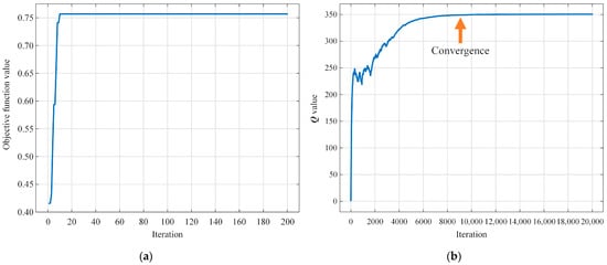 Convergence curve of the hybrid DBO-QL algorithm: (a) the convergence curve of the outer-layer DBO algorithm; (b) the convergence curve of the inner-layer Q-learning algorithm.