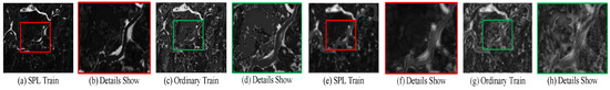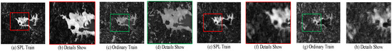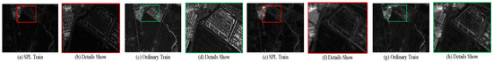 Figure 7, Figure 8, Figure 9 and Figure 10 record the difference maps generated by a JFM trained by a self-paced learning strategy and a JFM trained in normal mode on four data sets, where (a) and (c) are the difference maps obtained by small-scale JFMs, and (e) and (g) are the difference maps obtained by large-scale JFMs; (b), (d), (f), and (h) show the details of the difference maps. As previously analyzed, large-scale JFMs usually result in smoother difference maps but less detail retention, while small-scale JFMs result in higher detail retention but more abnormal noise points. In addition, it can be seen that after introducing the self-paced learning strategy into the JFM training process, the difference information of the generated difference map is more obvious. This is because the self-paced learning strategy focuses on low-loss samples, which are mainly distributed in the unchanged area in the remote sensing image. In the JFM training process, the high-loss samples in the changing area are usually weighted with a smaller weights relative to the loss, thereby inhibiting the model from learning the heterogeneous mapping relationship of this part of the sample. In the detailed display image, we can see that the JFM trained by the ordinary mode has more noise in the difference image. This is because the data of the changing region induce the non-uniform mapping on the JFM learning image, and this non-uniform mapping relationship causes the JFM to map the data of the unchanged region to the feature space with large differences, resulting in more noise in the unchanged region.