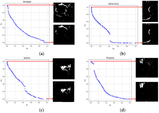 Through MOPSO, a set of Pareto-optimal solutions can be obtained to balance detail preservation and noise suppression. According to the membership matrix, the binary change map corresponding to each Pareto-optimal solution can be obtained. In addition, this study uses all the change maps of the threshold method for robust evaluation to obtain the final high-precision change map. Specifically, for the change pixel on each change map, if the number of change maps that divide the pixel into the changed class is greater than the set threshold (), the pixel is divided into the change class. Otherwise, the pixel is considered to be an unchanged region. The formulaic expression is expressed as follows:
