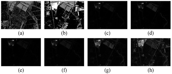 The features of the two images are simple; they just show land and river. The problem is in the significant speckle noise present in the SAR image. Figure 21a,b show the classification results of PCC. Figure 21c–h show the difference maps obtained by SCCN, CACD, CGCD, PMA, the small-scale JFM (JFM-S), and the large-scale JFM (JFM-L), respectively. Figure 22 is the change map obtained by all methods, and Table 4 is the index of the change map obtained by all methods. It can be seen that the change map obtained by SMJFM is the closest to the real label visually, the number of errors detected is smaller, and the overall accuracy is higher. In addition, it can be seen from Figure 21 that the comparison between the changed region and the unchanged region of the difference map obtained by SMJFM is more significant, which is due to the introduction of the self-paced learning training mechanism, while CACD only introduces common information into the feature vector, which leads to the autoencoder capturing the inconsistent mapping in the changed region during the learning process.