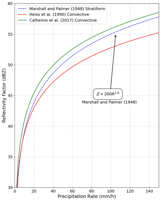 Z–R relationships used for operational purposes in the context of Paraná state, depicting various methodologies. The dashed blue line represents the stratiform precipitation relationship by [4], the red line illustrates the convective precipitation relationship [14], and the green line depicts the convective approach by [13]. The x-axis represents the precipitation rate in millimeters per hour (mm/h), and the y-axis represents the reflectivity factor in decibels relative to Z (dBZ). An increase in precipitation rate entails an increase in the reflectivity factor. Adapted from [16].