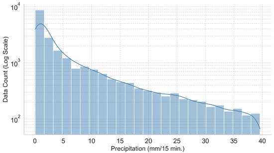 The distribution of the number of events of precipitation data accumulated in 15 min intervals after data cleaning in the period of 2018–2022. Values below 0.2 mm/15 min were not considered. Based on [11].