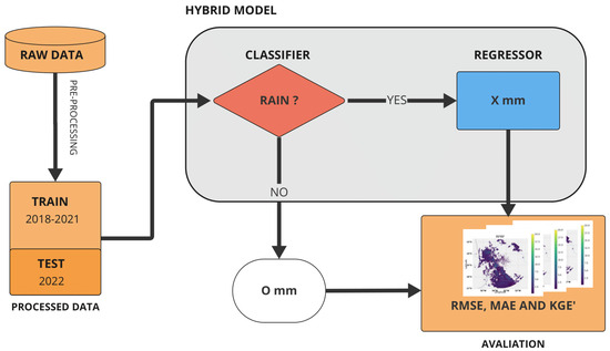 A diagram of the machine learning model’s workflow. It presents the data flow and the hybrid model. The classifier is used to verify whether there is rain. If so, the regressor is used to estimate the amount. Finally, the model’s performance is measured through metrics such as the mean absolute error (MAE) and root mean square error (RMSE).