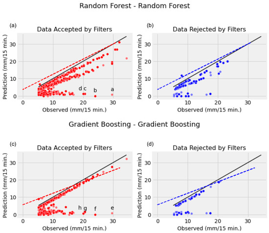 Analysis of the prediction accuracy for rainfall events above 5 mm observed per 15 min, using two machine learning models: Random Forest–Random Forest and Gradient Boosting–Gradient Boosting. Panels (a,c) show data points accepted by the filters, where the predictions closely aligned with the observations are depicted in red. Panels (b,d) depict data points rejected by the filters, where predictions that significantly diverged from the observations are shown in blue. The solid black line represents the accuracy of the prediction, and the dashed lines show the extent of deviation that is acceptable. Each letter from a to h corresponds to specific outlier points detailed in the text, highlighting the necessity of applying filters to improve the model performance.