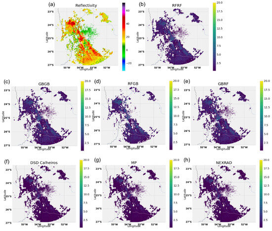 A comparison of the radar reflectivity and estimated precipitation rates across multiple algorithms and theoretical Z–R relationships on 12 July 2023, at 22:30 UTC. Panel (a) displays the radar reflectivity map with values ranging from −20 to 60 dBZ, indicating the intensity of the radar echo. Panels (b–h) show the precipitation rates predicted by various models (RFRF, GBGB, RFGB, GBRF, DSD Calheiros, MP, NEXRAD) across the same geographic region, measured in mm per 15 min. These maps provide insights into how the different algorithms interpret reflectivity data to estimate precipitation.