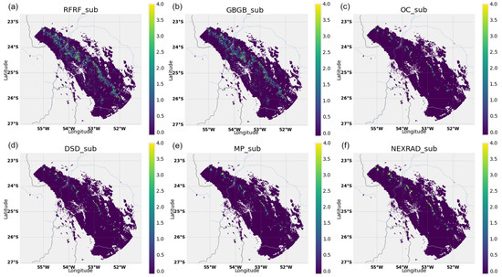The comparison between the station-obtained data values and those derived from the radar images (as illustrated in Figure 8) reveals a tendency for overestimation within both metrics. Specifically, the machine learning models RFRF (Figure 8a) and GBGB (Figure 8b) exhibit this overestimation, closely followed by the OC_Sub (Oracle) model (Figure 8c).
