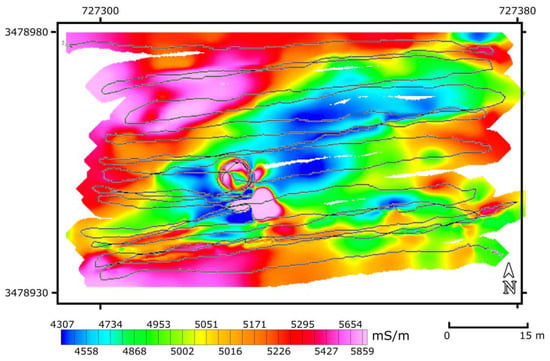 Six apparent electrical conductivity maps were produced, each one representing the integration of all conductivity values down to the effective depth penetrated by each one of the six frequencies (see Supplementary Materials). In general, all six frequency maps portray the same image of a SW-NE trending “patch” of low ECa (from ~4350 mS/m in the example given in Figure 4) that is distinctly different from its surroundings. To the northwest and southeast of this patch, high values of ECa (5800 mS/m and above) are reached. In each map, the steel drilling pipe is evident by a circular anomaly of high ECa, although the regional influence of this feature on the data was removed during processing. The remaining effect of this pipe is so strong in the first frequency interval (57,225 Hz corresponding to the integration of all electrical conductivities from the surface down to a depth of 1.7–2.6 m) that it saturates its surroundings and appears as a large patch of high conductivity. A consistent, high conductivity anomaly lies to the north of the drill pipe. A number of prominent linear features are also visible in the data (Figure 4). For all frequencies, these linear features have relatively low ECa values compared to their surroundings.