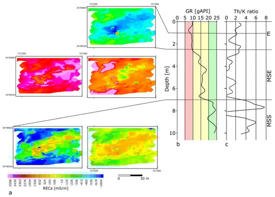 Comparison between (a) FDEM RECa maps. From top to bottom and left to right: 24,425–57,225 kHz; 10,425–24,425 kHz; 4425–10,425 kHz; 1925–4425 kHz; 825–1925 kHz. Negative values represent an increase in ECa values between the first and second volumes, similar to the result of simple subtraction (Figure 4). (b) Gamma Ray is logging data from the ICDP 5017-3-C borehole. Colors divide the graph into cutoff values suggested by [29]. White 0–5 gAPI; Pink 5–10 gAPI; Yellow 10–20 gAPI.; Green 20-25 gAPI (c) Th/K ratio. The text to the right indicates the predicted lithology. E—evaporates. MSE—medium to thick-bedded mudstone to sandstone with evaporates. MSS—mudstones interbedded siltstones/sandstones. Horizontal and black lines mark the depths of the maximum cutoff values, while angled black lines divide the FDEM inversion maps accordingly.