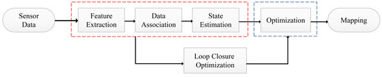 The framework of SLAM systems generally consists of five parts: sensor data acquisition and processing, front-end odometry (indicated within the dashed red boundary in Figure 1), back-end optimization (indicated within the dashed blue boundary in Figure 1), loop closure detection, and map construction. Initially, LiDAR or visual sensors collect data, which is then roughly estimated for pose transformations between data frames by the front-end odometry. This is followed by global trajectory optimization through the back-end optimizer, after which precise poses are used for map construction. During the operation of SLAM, loop closure detection continuously identifies scenes traversed by the robot to eliminate cumulative errors.