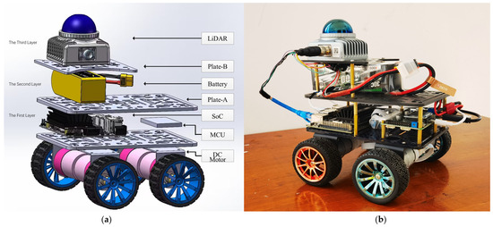 Addressing the limitations of existing solutions, this paper draws inspiration from automotive structures, adopting a four-wheeled rubber tire and custom carbon plate chassis to enhance the vehicle’s stability and load capacity through the superior ground traction of rubber tires and the high structural integrity of carbon plates. Departing from the traditional Ackermann steering geometry found in automobiles, this vehicle incorporates four fixed DC geared motors, a configuration that simplifies the mechanical structure and reduces component count, thereby significantly lowering manufacturing and maintenance costs while ensuring agility and stability. The ability to independently control the direction and speed of each motor endows the system with effective spot-turning capabilities, essential for meticulous steering and path planning in restricted areas. The base plate’s design features a 17:11 aspect ratio and a triple-layered structure, expanding sensor installation space while optimizing body volume and weight to achieve a balance between high performance and minimized cost and size. The result is shown in Figure 2, and The specific parameters of the radar sensors used in this SLAM system are shown in Table 1.
