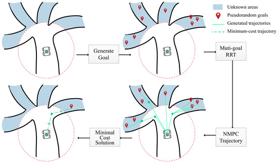 In the equation, denotes the actuation cost, represents the distance cost, and signifies the exploration or information gain cost. The obstacle-free space, , indicates the navigable area within the three-dimensional positional space contained by the current map configuration, . By finding the minimum values, the optimal trajectory for the exploration task is determined, delicately balancing between swiftly discovering more space, limiting actuation based on a dynamic system model, and minimizing effort in movement. For efficient and precise exploration path derivation, we employ a multi-goal RRT framework, utilizing Nonlinear Model Predictive Control (NMPC) [52] to optimize path execution, minimizing energy consumption and ensuring path feasibility [53]. The exploration framework is shown in the following Figure 4.