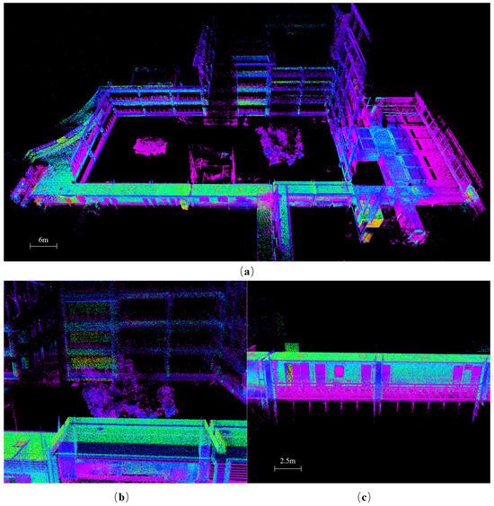 To comprehensively cover complex indoor scenarios and validate the localization and mapping performance of the SLAM system, we controlled a small vehicle to collect data along main routes in both indoor and outdoor environments. All experimental data were collected from Wuhan, China, encompassing simple indoor scenes, complex indoor scenes, and large-scale mixed indoor-outdoor settings. The vehicle traveled at a speed of approximately 0.5 m per second through these scenarios, circling around the buildings or scenes before returning to the starting point. The LiDAR and IMU were mounted approximately 20–22 cm above the ground. The scanning rate of the LiDAR was set to 10 Hz, with an average processing time of 25 ms per scan and 20,000 points per scan. The mixed scenes included terrains at varying altitudes, posing additional challenges for the SLAM system’s positioning accuracy and three-dimensional reconstruction.