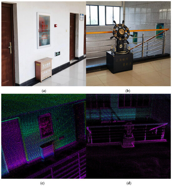 The reconstruction effect of the detail part. (a,c) Physical drawings and point clouds of fire extinguisher hydrants. (b,d) Physical drawings and point clouds of decorations.