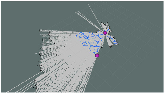 We used the same indoor environment as in Section 4.2.3 to test it. At the start of the experiment, we manually placed the robot at the center of the map for initialization. After setting the boundaries of the map, the robot began its autonomous exploration. During the exploration process, the robot dynamically planned its path using the RRT algorithm to avoid obstacles and efficiently cover unknown areas. The 3D multi-goal RRT works as shown in Figure 14; the exploration path is generated on a 2D plane, although the car will eventually be reconstructed on a 3D map. We paid special attention to the robot’s responsiveness to sudden obstacles and its navigation and obstacle avoidance efficiency in complex environments. Multiple experiments ensured the system’s exploration was robust and continuous.