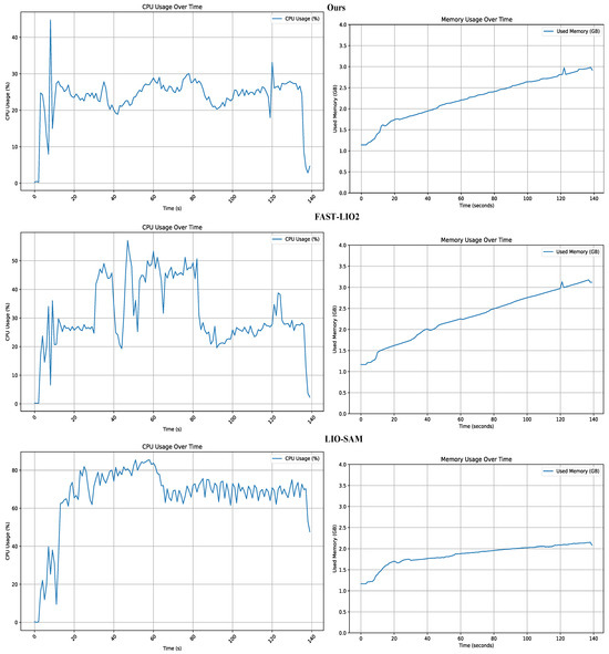 Since this SLAM system primarily utilizes CPU and memory resources, we employed the ‘SAR’ and ‘VMstat’ tools to monitor the CPU and memory usage in real time on our hardware platform, thus assessing the resource consumption of our algorithm. All tests were automatically conducted in a consistent environment using scripts and carried out on the 4.1 dataset. We also measured the resource utilization of SLAM systems based on fast-lio2 and lio-sam for comparison. The results are shown in Figure 17.
