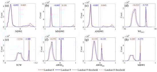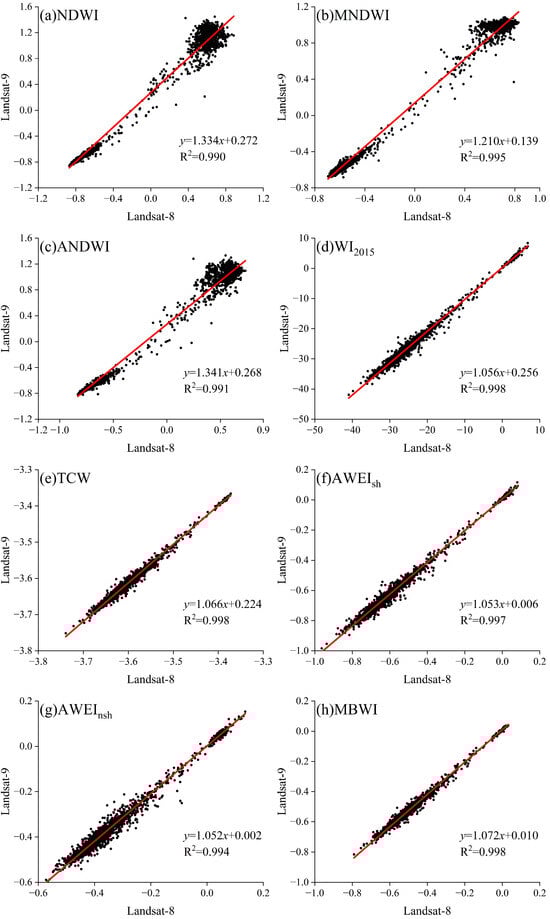 Chen J, Wang Y, Wang J, Zhang Y, Xu Y, Yang O, Zhang R, Wang J, Wang Z, Lu F, et al. The Performance of Landsat-8 and Landsat-9 Data for Water Body Extraction Based on Various Water Indices: A Comparative Analysis. Remote Sensing. 2024; 16(11):1984. https://doi.org/10.3390/rs16111984