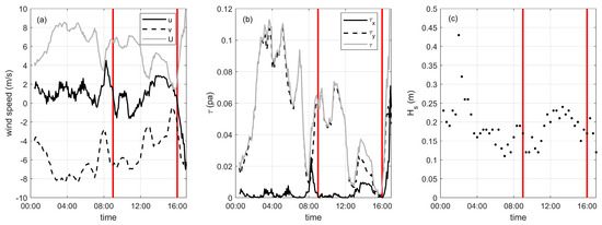 Throughout the experiment, the average wind speed was recorded at 4.87 m/s, with the southward wind speed (4.50 m/s) significantly exceeding the westward wind speed (0.91 m/s) (Figure 2a). The corresponding average wind stress () was calculated at 0.04 Pa (Figure 2b), based on the drag coefficient parameterized by , where a = s/m [38]. The significant wave height, measured by a buoy located 30 km from the dye release point, was approximately 0.2 m (Figure 2c). Since this buoy was positioned behind an intervening island, the wave height at the experiment location would be slightly higher than 0.2 m. The field experiment, encompassing observations of both the dye patch and surface currents, took place under calm weather conditions marked by light northerly winds and small wave activity.