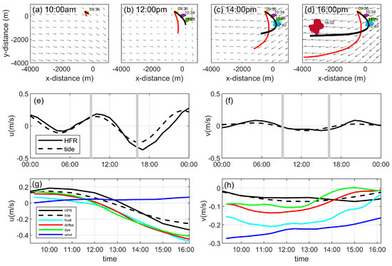 (a–d) Dye and drifter trajectories overlaid on the background of HF radar current (HFR). Comparison of Eulerian HFR and tidal velocities (modeled from the TMD MATLAB toolbox version 2.5) at a fixed location near the dye release point in the east–west direction (e) and north–south direction (f). Panels (g,h) compare the Eulerian velocities in (e,f) with Lagrangian observational velocities during the experiment duration, marked by two gray lines in (e,f). Wind speeds in (g,h) are scaled down by a factor of 20.