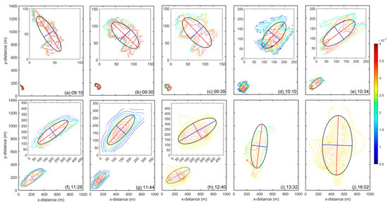 Figure 5 illustrates the temporal evolution of dye concentration, with an ellipse fitting the dye patch at various times. Following the completion of dye injection, a long dye strip approximately 100 m in length and 20 m in width formed in an east–south to west–north direction (Figure 5a). Initially, the dye distribution showed a broad area of uniform concentration for the first 30 min (Figure 5a–c). Subsequently, by 10:30 a.m., the direction of the elongated dye patch reversed, shifting to an east–north to west–south direction, persisting until 1 p.m. During this phase, rapid shifts in tidal current direction led to a significant decrease in the speed of surface currents, accentuating the relative contribution of wind to the dispersion pattern. The direction of elongation, approximately 45 degrees clockwise relative to the prevailing southward wind, indicates the potential impact of wind on the elongation pattern. After 1 p.m., the tidal current accelerated westward, and the elongation direction became aligned with the northerly wind direction.