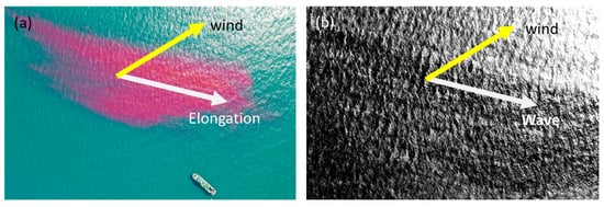 (a) Raw RGB images taken by a drone 2.3 h post-dye release (around 11:30 a.m.); (b) a magnified segment of (a), converted to grayscale to emphasize the wave propagation direction. The angle between the two vectors is approximately 45 degrees.