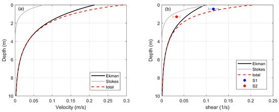 To understand this observation further, we performed analytical calculations based on in situ measurements to assess the near-surface vertical shear, thereby estimating the contributions of the Ekman current and Stokes drift components to the observed vertical shear. The Ekman depth [54], where is the Coriolis parameter, using observed during the experiment, was calculated to be 2 m. This depth signifies the layer in the ocean at which the effect of wind-driven surface currents, influenced by Earth’s rotation, markedly diminishes. The calculated surface currents driven by Ekman flow ( and ) were approximately 0.20 m/s. Based on the surface current calculation, the Ekman spiral represented as and [55] at the vertical transact oriented 45 degrees from the south is depicted in Figure 8. This illustration emphasizes that vertical shear is predominantly concentrated within the upper 5 m. Furthermore, Figure 8 also shows the vertical velocity profile driven by Stokes drift for a monochromatic wave () [55]. This velocity profile might be slightly underestimated because the wave height was measured from a buoy located near intervening islands.