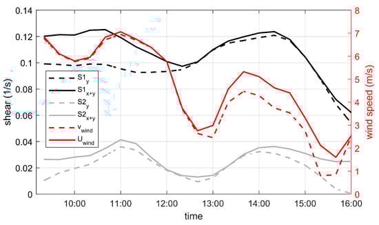Shear estimation using two tracers (float and drifter). S1 and S2 represent the shear calculated from the velocity difference between the float and drifters (S1) and between the drifters and dye (S2). The subscripts ‘y’ and ‘x + y’ indicate the y direction (north–south or NS) component and the total sum of the NS and east–west (EW) components, respectively. denotes the total wind speed, and represents the NS component of the wind speed. The axis for wind speed is on the right side.
