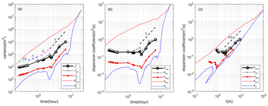 Dispersion phases can be delineated by examining the slope of the diffusion diagram [56,57]. Linear increases in the second moment of dye distribution over time signify the diffusive phase, quadratic increases denote ballistic dispersion, and cubic increases () suggest either Richardson dispersion [58] or are indicative of unsteady shear dispersion [59]. Figure 10 illustrates the temporal evolution of horizontal variance for three cases: a dye patch; a combination of a float and three drifters experiencing significant vertical shear; and three drifters subjected to minimal vertical shear. During the 7 h observation period of dye dispersion, the dye patch exhibited distinct dispersion phases. Initially, sub-diffusion was observed for the first 30 min, likely due to restricted dispersion caused by the temporarily buoyant dye patch with a broad, uniform concentration distribution that limited vertical diffusion until the tracer’s density matched the surrounding water density. Subsequently, the total variance () transitioned to a diffusive phase , while the variance along the major axis entered a ballistic phase , suggesting shear dispersion [60] likely driven by vertical shear related to the Ekman current and Stokes drift. This period corresponds to the elongation of the dye patch, with its direction deviating by 45 degrees clockwise from the wind direction. Later, both the variances in major and minor axes exhibited a slope, indicating a transition to unsteady shear dispersion.