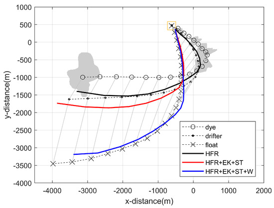 By combining near-surface currents from HF radar with analytical calculations of Ekman currents and Stokes drifts, we employed a particle tracking model [68] to forecast tracer paths, as illustrated in Figure 11. Trajectories calculated using HF radar currents (black line) closely followed those of drifters at an average depth of 0.8 m (dot-dashed line), showcasing HF radar’s capability to accurately capture surface currents up to a 1 m depth. However, particle paths intersected the periphery of the wind-elongated dye patch, leading to a slight deviation of trajectories predicted by HF radar from those of the dye patch. This discrepancy arises because the dye patch diffuses across a broader depth, exceeding 5 m, thus affecting its dispersion differently. When the Stokes drift and Ekman current were combined with HF radar data (red line), the combined effect steered particle paths predominantly southwestward. Adding 1% of the wind speed at a height of 10 m (blue line) further refined the particle trajectories, aligning them closely with that of the float (×-dashed line). This variation in tracer paths, influenced by the selection of current components, highlights the critical need for a precise integration of the Ekman current and Stokes drift, alongside a wind effect, to accurately predict the dispersion patterns of tracers with varied characteristics.