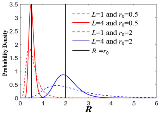 Finally, setting a new increment value , we can also obtain the solution of by (8) via the aforementioned searching approach, but with two differences. The first difference is that the searching start of is set as rather than , because, apparently, the solution of is larger than r. The second difference is that can be set larger than (for example, ) to save computational time, due to the long-tailed distribution nature of the PDF.