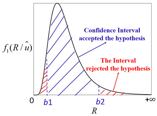 In the rest of this paper, for simplification, we use to replace . As in the example shown in Figure 3, given a lower limit and an upper limit , the probability that R is between and (the blue area in Figure 3) can be calculated by: