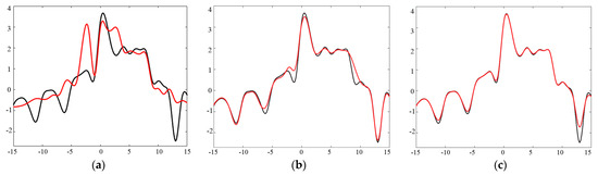 Signal intensity of the clean reference (black line) and the filtered image (red line) along a line. (a) The refined Lee filter. (b) The PPB filter. (c) The SAR-BM3D filter.