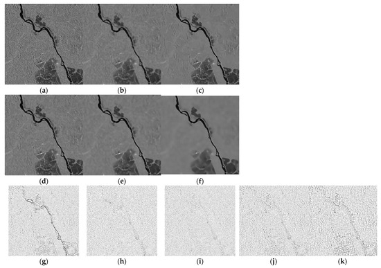 Filtering experiment on the ALOS-PALSAR image. (a) The original image. (b) The refined Lee filtered image. (c) The SAR-BM3D filtered image. (d–f) The images filtered by the PPB filter with IT varied from 2 to 4. (g–k) The ratio images of (b–f), respectively.