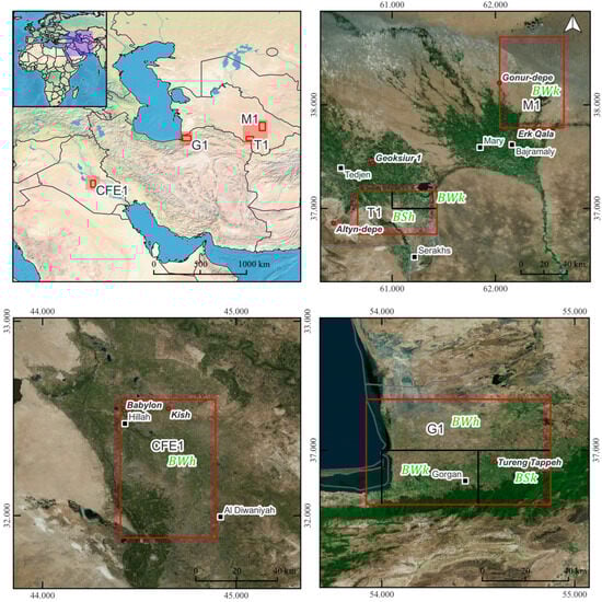 The aim of this study is to test the potential of multi-temporal Sentinel 1 and 2, LANDSAT 5, and TanDEM-X digital surface models using GEE to map palaeo-channels and irrigation canals in the Middle East, Iran, and Central Asia, which are part of the UnderTheSands project. Four research areas have been chosen for this study (Figure 1). The first selected area of study is the Central Floodplain of the Euphrates River in Iraq (CFE1). One area was selected in Iran: Gorgan Plain (G1). Two areas have been chosen in Turkmenistan: the Murghab (M1) and the area between Serakhs and ancient Geoksyur oases watered by the Tedjen River (T1) (Table 1). All selected areas have been the subject of intensive field survey projects. The studies conducted in the past also allowed the mapping of irrigation networks, but lower-resolution datasets were used.