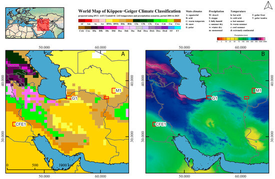 Climate of the areas according to Köppen-Geiger Climate Classification (A1FI: 2001–2025) (A) and mean precipitation (B) (Made with Natural Earth) [,].
