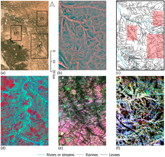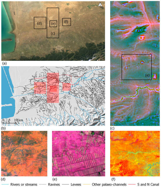 Gorgan plain (G1): (a): mean annual values of LANDSAT 5 images; (b): network of levees and palaeo-channels; (c): composite of three MSRM rasters (0–250, 250–750, 1000–5000); (d): LANDSAT 5 SMTVI: March-April, May–June, July–August; (e): composite of standard deviation of VH asc, VV, VH desc bands of Sentinel-1; (f): LANDAT 5 TCT wet v1; (© DLR 2022, TanDEM-X Science Digital Elevation Models call (DEM_HYDR3723)).