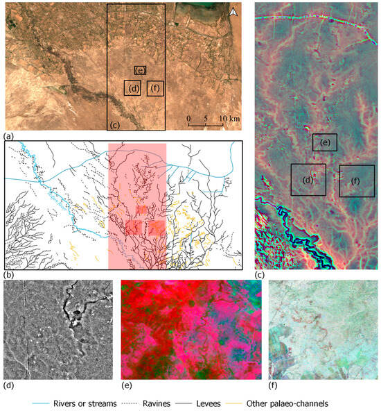 The area between Serakhs and Geoksyur oases (T1). (a): mean annual values of Sentinel-2 images; (b): network of levees and palaeo-channels; (c): Composite of three MSRM rasters (0–250, 250–750, 1000–5000); (d): MSRM (0–250); (e): Sentinel-2 TCT dry v1; (f): Seasonal composite of VH band in desc polarization of Sentinel-1 (© DLR 2022, TanDEM-X Science Digital Elevation Models call (DEM_HYDR3723).
