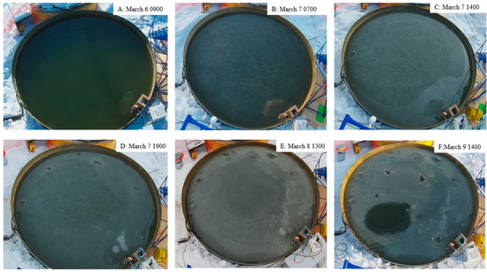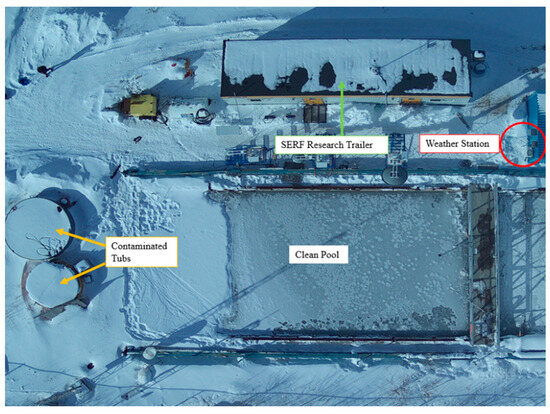 This study was conducted at the University of Manitoba Sea-ice Environmental Research Facility (SERF) from 6–9 March 2023 (see the next section for details on the timeline). SERF is an experimental research facility that is equipped with an outdoor clean seawater pool, as well as sea ice tubs that can be contaminated (Figure 1). The tubs can be heated with a removable heater for open seawater experiments and studies that focus on the growth of sea ice. This study was conducted in a tub that is 4 m in diameter and 1 m in depth and constructed with fiberglass. The seawater that is in the SERF tub is artificial, made from a chemical formulation of groundwater and salts [9,25]. For this study, the salinity of the water was 20.9 PSU which is notably lower than the Arctic Ocean, but similar to what can be found in an estuary [37]. SERF also has a local weather station that monitors the air temperature and relative humidity (Figure 1).