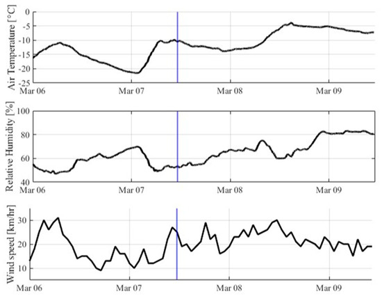 Temporal Variation of Air Temperature, Relative Humidity, and Wind Speed Throughout the Study Period. The Time of Diesel Injection is Marked by a Blue Line.