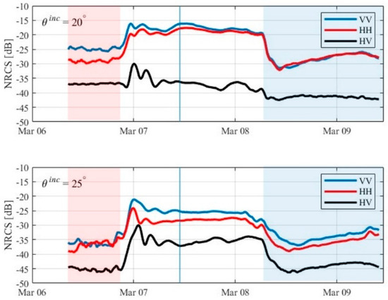 NRCS values for C-band and the elevation incidence angles of 20° and 25° were plotted in a time series to establish the radar response throughout the study period. In Figure 6, σVV is the color black (abbreviated as VV), σHH is the color blue (abbreviated as HH), and σHV is the color red (i.e., cross-polarized signal, or HV). The results of the ρco and μ parameters for 20° and 25° are presented in Figure 7.