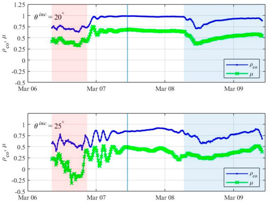 Copolarization correlation coefficient (ρco) and conformity coefficient (μ) for the 20° (upper panel) and 25° (lower panel) incidence angles. The red-shaded area is stage one, the non-shaded area is stage two, and the blue-shaded area is stage three. A solid vertical blue line denotes the time of diesel injection.